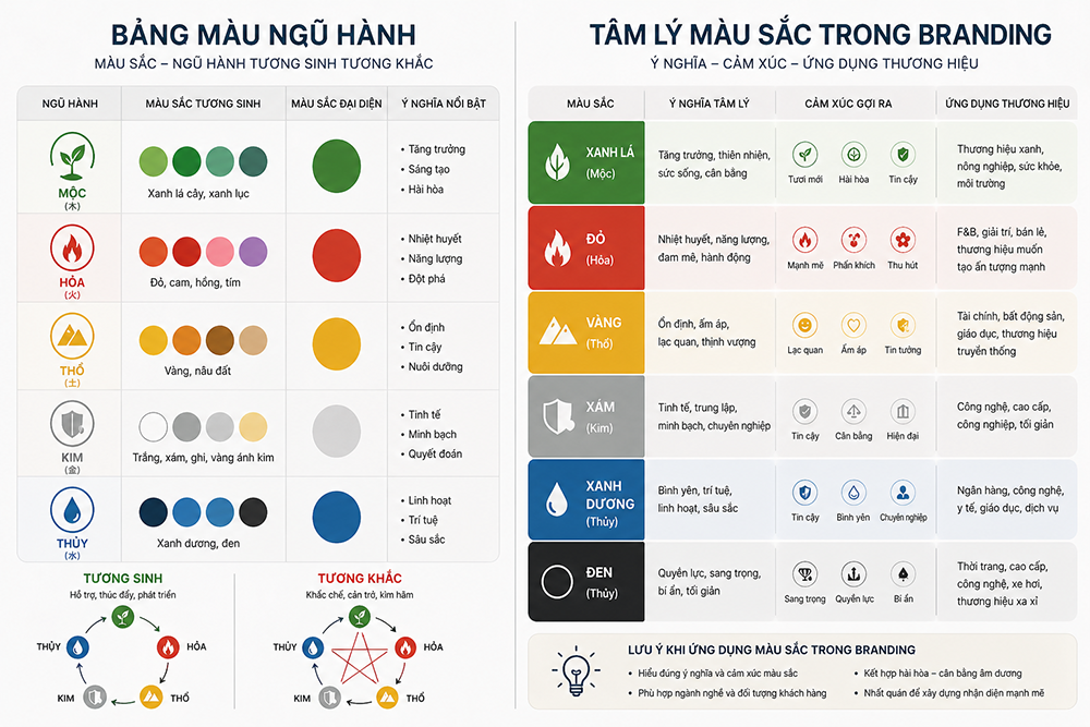 Màu sắc là yếu tố tác động mạnh nhất đến cảm xúc khách hàng. Trong phong thủy thương hiệu, màu sắc không chỉ cần đẹp mà còn cần hài hòa về năng lượng.